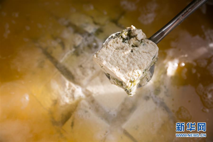 这是贵州省毕节市大方县易地扶贫搬迁城镇化安置区奢香古镇居民龙诗有制作的菜豆腐(1月24日摄)。新华社发(罗大富 摄)