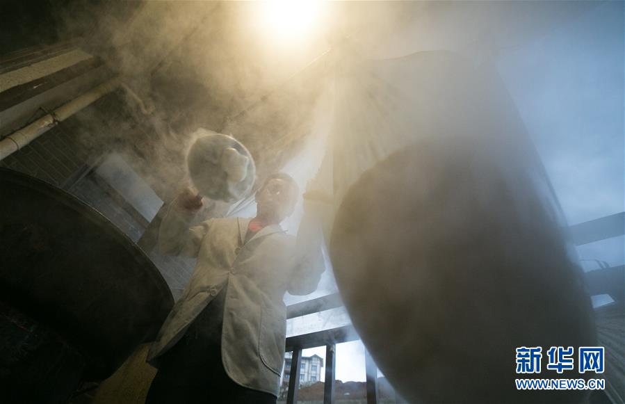1月24日,在贵州省毕节市大方县易地扶贫搬迁城镇化安置区奢香古镇,龙诗有制作豆浆。新华社发(罗大富 摄)