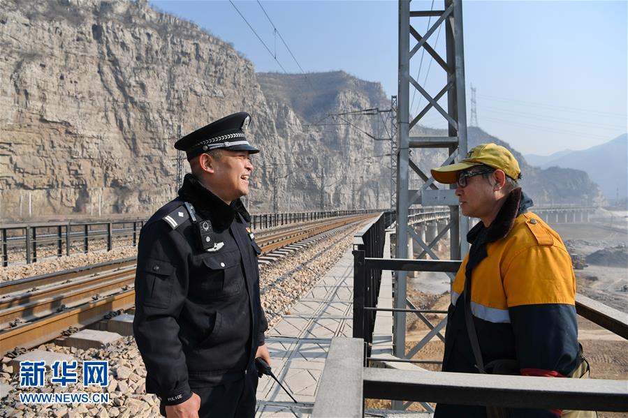 1月24日,穆建军在巡线途中和铁路工务段工作人员交谈。 新华社记者 牟宇 摄