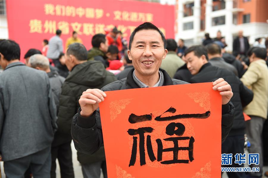 1月25日,在贵州遵义余庆县易地扶贫集中安置点,居民展示领到的福字。 新华社发(贺春雨 摄)