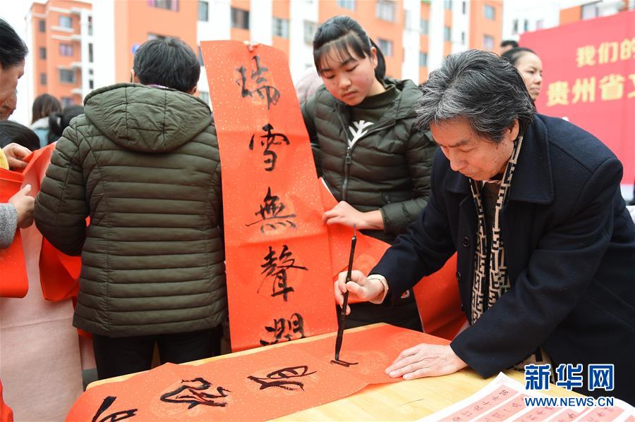 1月25日,在贵州遵义余庆县易地扶贫集中安置点,书法家为居民写春联。 新华社发(贺春雨 摄)