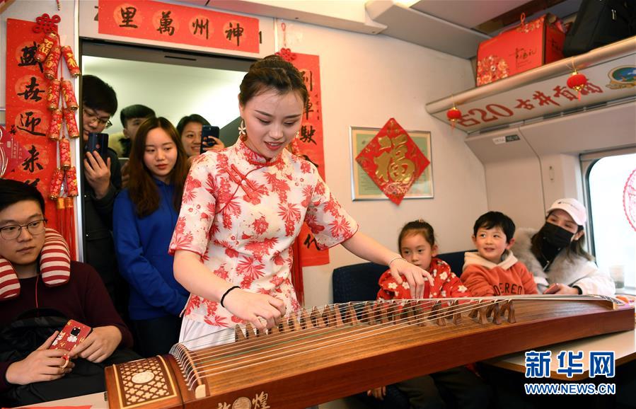 1月25日,合肥客运段志愿者在车厢里为旅客弹奏古筝。 新华社记者 刘军喜 摄
