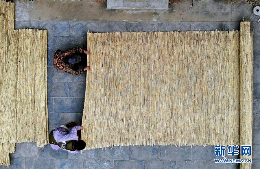 1月25日,巨鹿县乍补寨村村民整理编织好的苇箔(无人机拍摄)。 河北省巨鹿县观寨乡乍补寨村是当地小有名气的芦苇编织专业村,村民利用冬闲时节,将芦苇加工成颇具特色的苇箔、苇席等产品销往周边地区,促进冬季增收。 新华社记者 牟宇 摄
