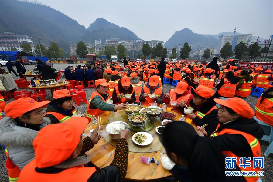1月25日,环卫工人在宣恩县珠山镇莲花坝村一广场上吃“刨汤”宴。 新华社发(宋文 摄)