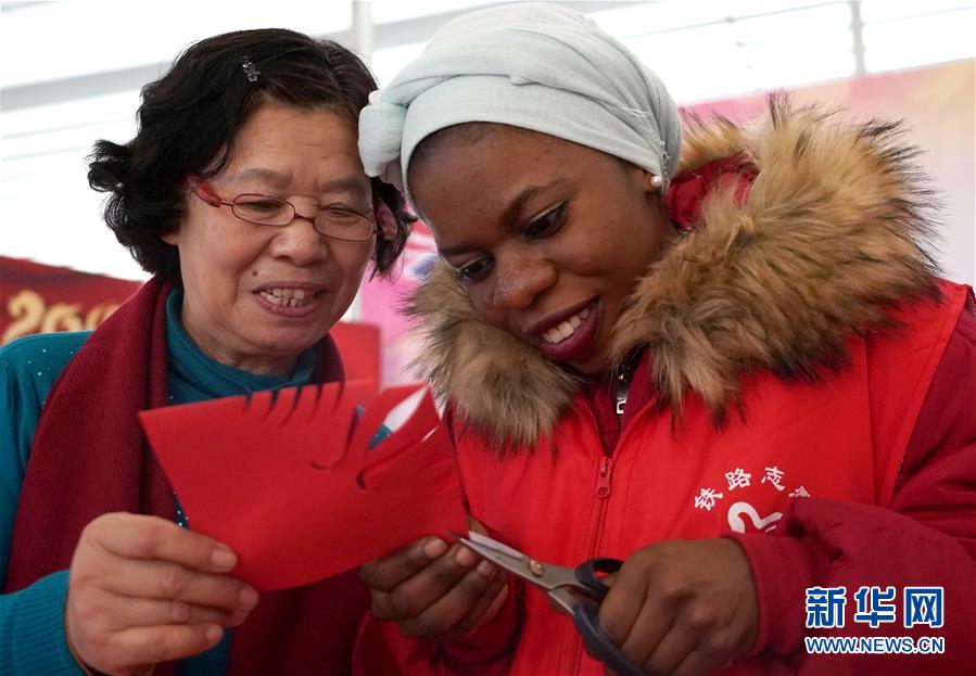 1月25日,来自坦桑尼亚的志愿者蕾娜(右)在学习剪窗花。 新华社记者 李安 摄