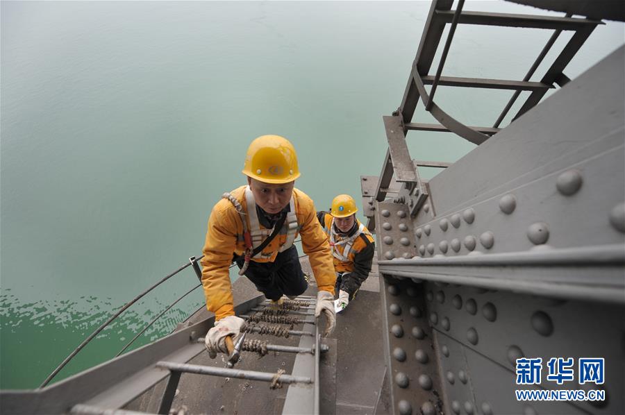 1月24日,桥梁工黄小利(前)攀爬枝城长江大桥,准备检修养护。 春运期间,车次增多,中国铁路武汉局集团有限公司荆门桥工段职工黄小利的工作更加繁忙。每天他都要和同事们一起,像“蜘蛛侠”一样攀爬于枝城长江大桥,检查桥墩、枕木等,为春运保驾护航。 新华社发(彭琦 摄)