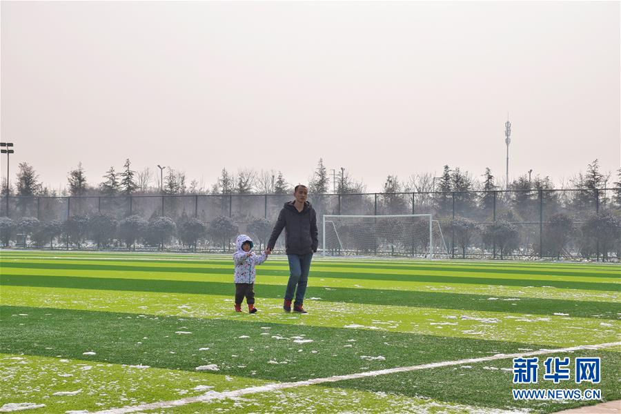 市民聂德义带着孩子在伊水游园内的足球场上漫步(1月10日摄)。 新华社记者 韩朝阳 摄