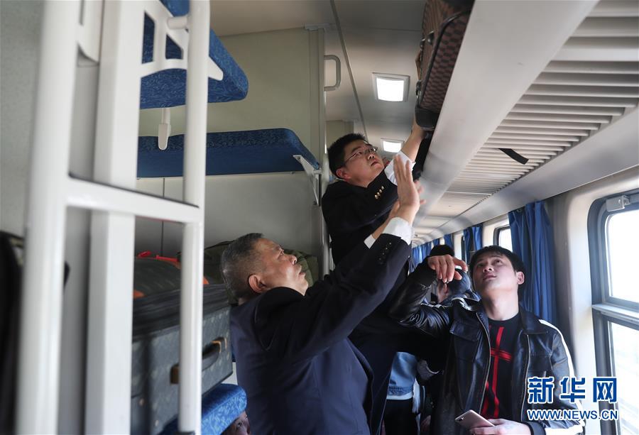 1月24日,在K4663次列车上,朱伟平(左)指导林康伦(中)整理旅客行李。新华社记者 丁汀 摄