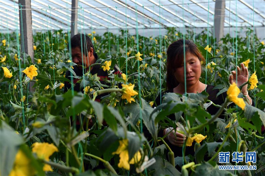 1月25日,在寿光市纪台镇齐家村,菜农李向莲(右)在蔬菜大棚里给丝瓜人工授粉。在2018年的洪涝灾害中,她家的大棚进水导致部分坍塌。 山东省寿光市在2018年洪涝灾害发生后,将蔬菜大棚修复重建作为加快灾后恢复生产的重中之重。目前,寿光市10.67万个受灾蔬菜大棚已有10.07万个完成加固修复,菜农们加紧生产,供应春节市场。 新华社记者 郭绪雷 摄