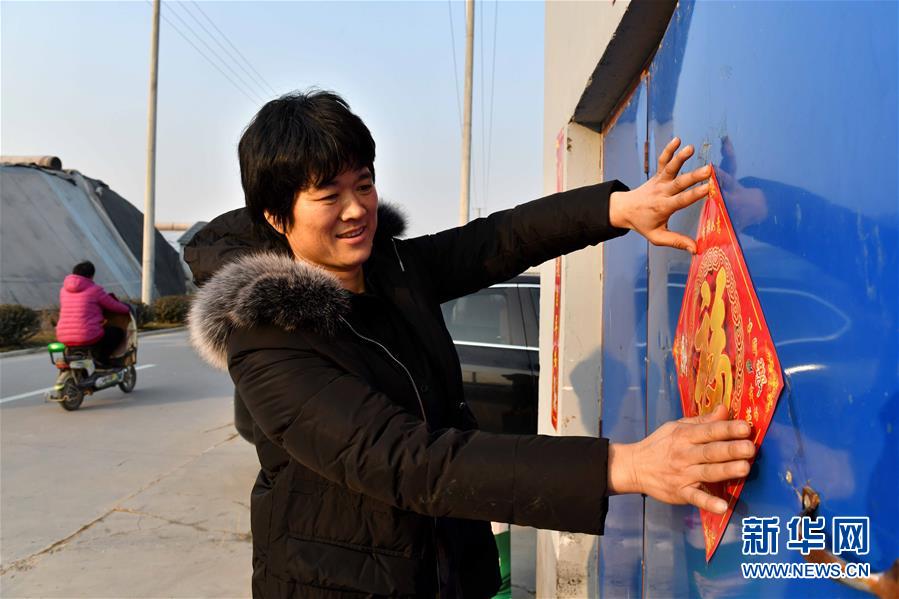 1月25日,在寿光市纪台镇东方东村,菜农孙志玲在蔬菜大棚的门上贴上对联和福字。在2018年的洪涝灾害中,她家的大棚进水1米多深。 山东省寿光市在2018年洪涝灾害发生后,将蔬菜大棚修复重建作为加快灾后恢复生产的重中之重。目前,寿光市10.67万个受灾蔬菜大棚已有10.07万个完成加固修复,菜农们加紧生产,供应春节市场。 新华社记者 郭绪雷 摄
