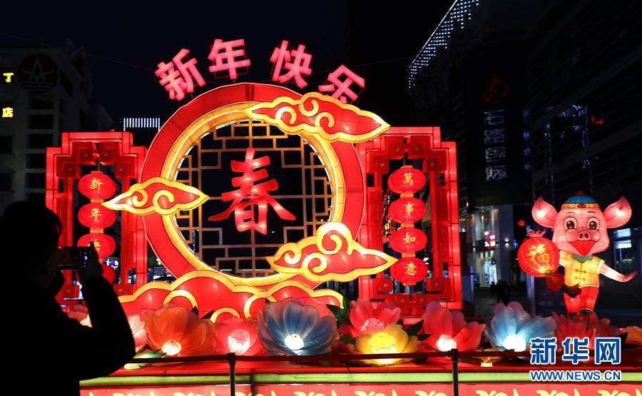 1月25日,市民在江苏苏州石路步行街上的“福猪迎春”彩灯前拍照。 随着春节临近,春联、福字和红灯笼扮靓了大街小巷。 新华社发(杭兴微 摄)