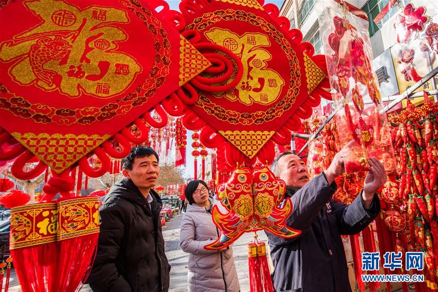 1月25日,市民在山东潍坊青州市一年货市场选购饰品。 随着春节临近,春联、福字和红灯笼扮靓了大街小巷。 新华社发(王继林 摄)