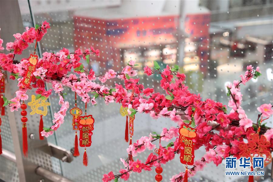 西九龙高铁站花枝红艳(1月25日摄)。 进入2019年春运,香港西九龙高铁站装扮得喜庆吉祥。 新华社记者 吴晓初 摄