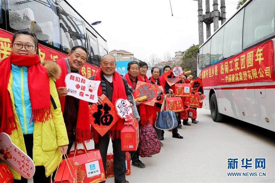 1月26日,工友们在大巴车旁排队登车。 新华社记者 方喆 摄
