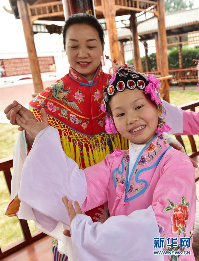 1月26日,湖北省秭归县希望小学教师姜莺(后)在教授学生戏曲动作。 新华社发(王辉富 摄)