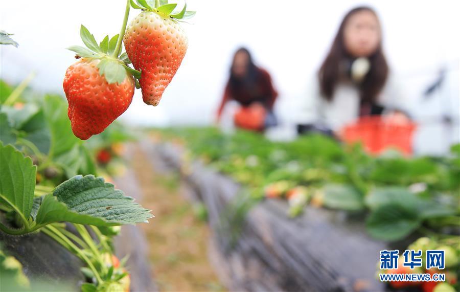 1月26日,游人在湖南省衡阳市衡阳县樟树乡的大棚草莓基地采摘草莓。