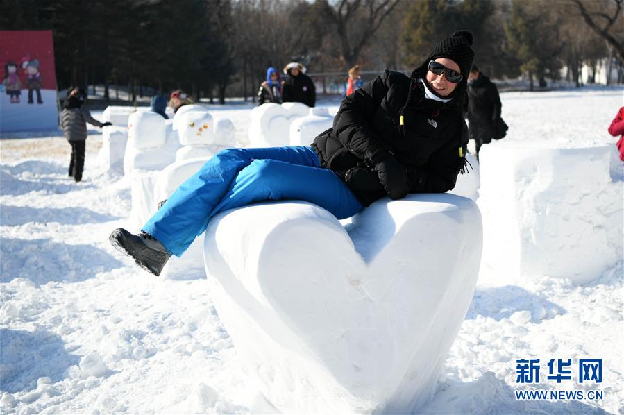 1月26日,一名外国游客坐到雪雕上留影。 新华社记者 王建威 摄