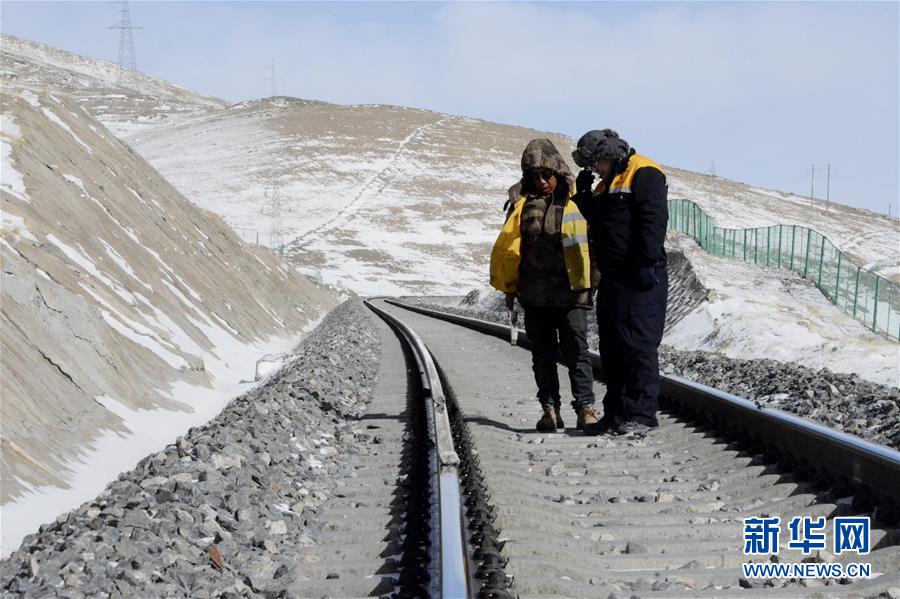 青藏铁路格尔木工务段望昆线路养护车间副主任于本蕃(右)和工友一起检查轨道平顺度(1月11日摄)。 新华社发(王浡 摄)