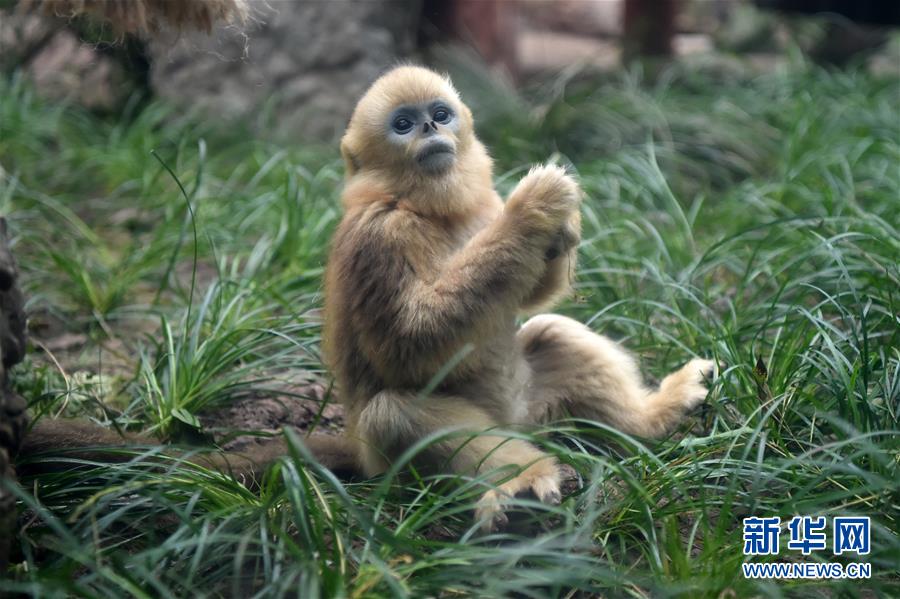 1月26日,川金丝猴“丁丁”在猴馆草坪上玩耍。 新华社记者 唐奕 摄