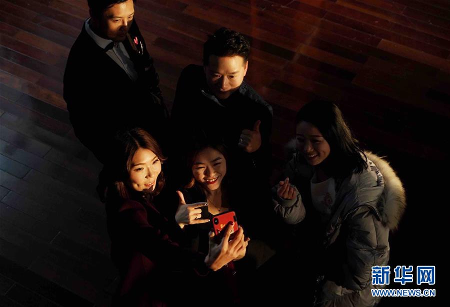 1月26日,长三角打工者艺术团成员冯瑞雪(前左)、张婷婷(前中)、黄景瑜(前右)等在正式演出前自拍留念。 新华社记者 季春鹏摄