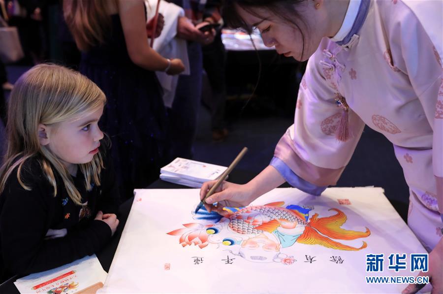 1月25日,在美国洛杉矶县贝弗利山市,一名女孩在“欢乐春节·魅力京津冀”活动上观看艺术家制作木版年画。 新华社记者 李颖 摄