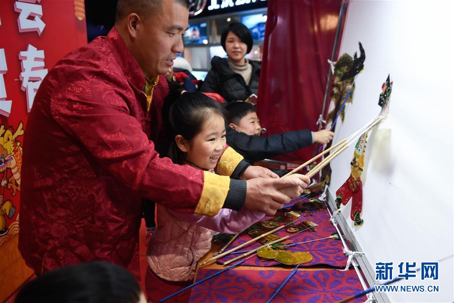 1月26日,小朋友在杭州市青少年活动中心体验皮影戏表演。 新华社记者 黄宗治 摄