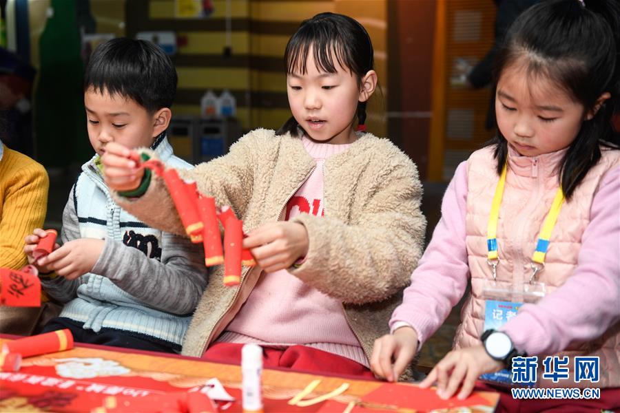 1月26日,小朋友在杭州市青少年活动中心手工制作“炮竹”等新春装饰品。 新华社记者 黄宗治 摄