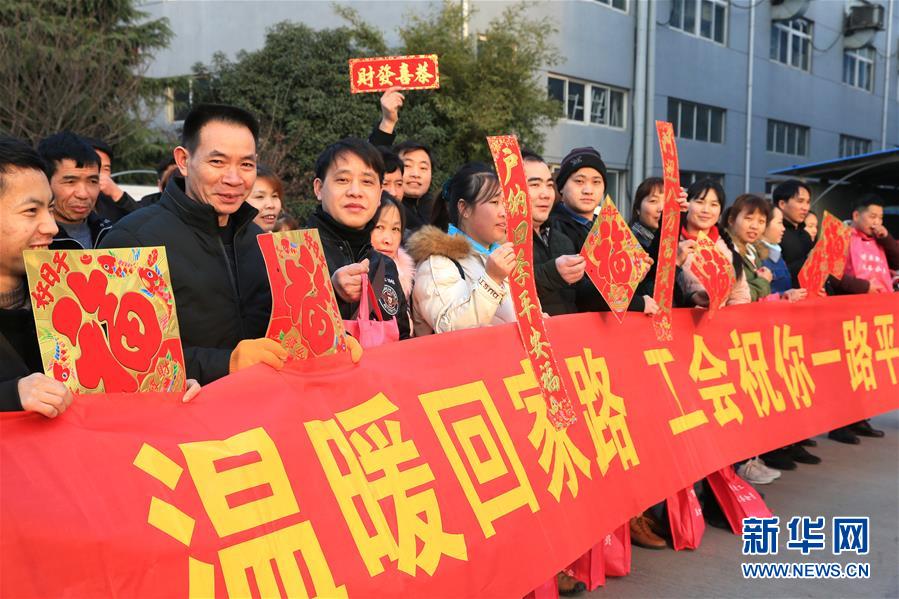1月26日,在浙江省德清县钟管镇一家公司,员工准备乘坐公司的包车踏上返乡旅程。 新华社发(姚海翔 摄)