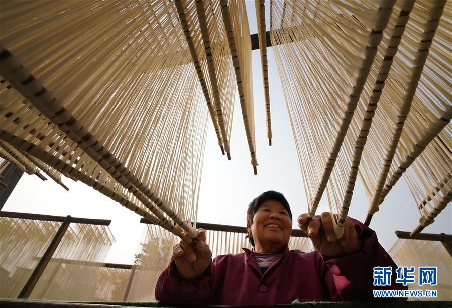 1月26日,新余市高新区马洪办事处王家下村村民赖八女赶制晾晒传统手工挂面供应春节市场。 新华社记者 宋振平摄