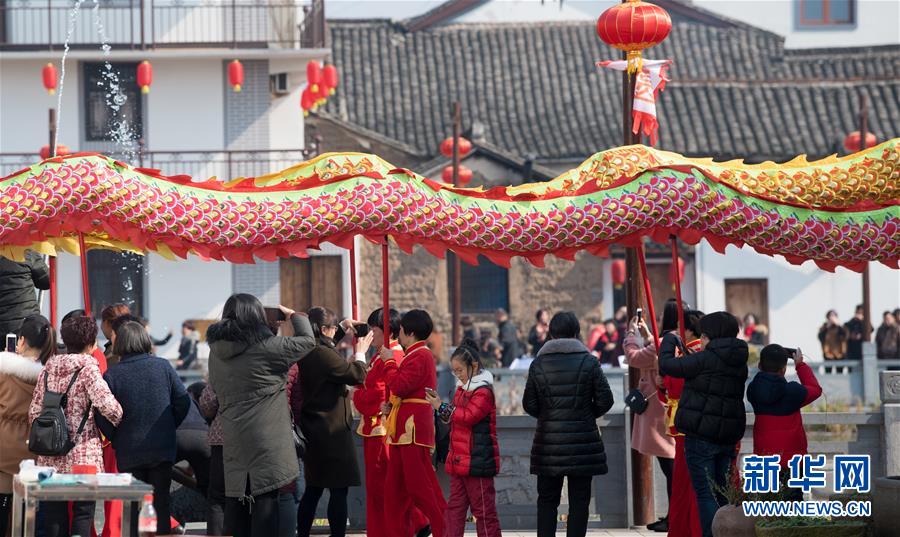 1月26日,游客在梅渚古村观看走街串巷的舞龙表演。 新华社记者翁忻旸摄