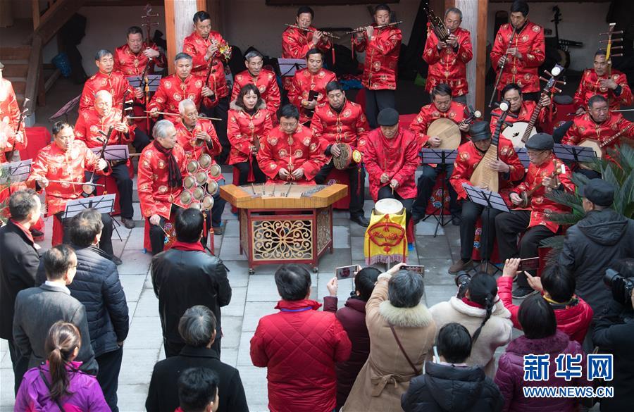 1月26日,游客在梅渚古村欣赏浙江省非物质文化遗产代表性项目“新昌十番”。 新华社记者翁忻旸摄