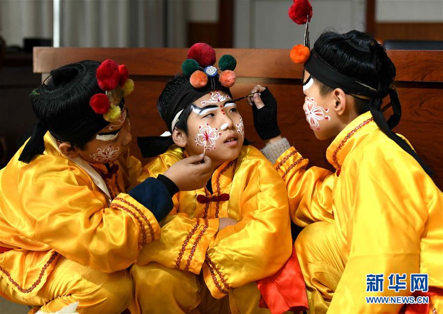 1月26日,在青泉村村民活动中心,孩子们在绘制社火脸谱。 新华社发(陈其保 摄)