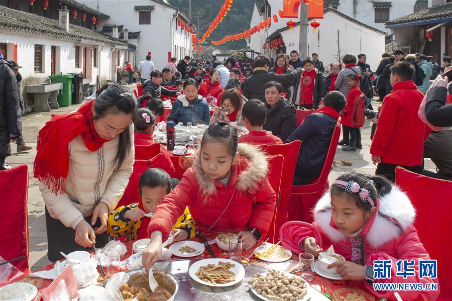 1月26日,人们在鹿亭乡中村品尝齐家长桌宴。 新华社发(张辉 摄)