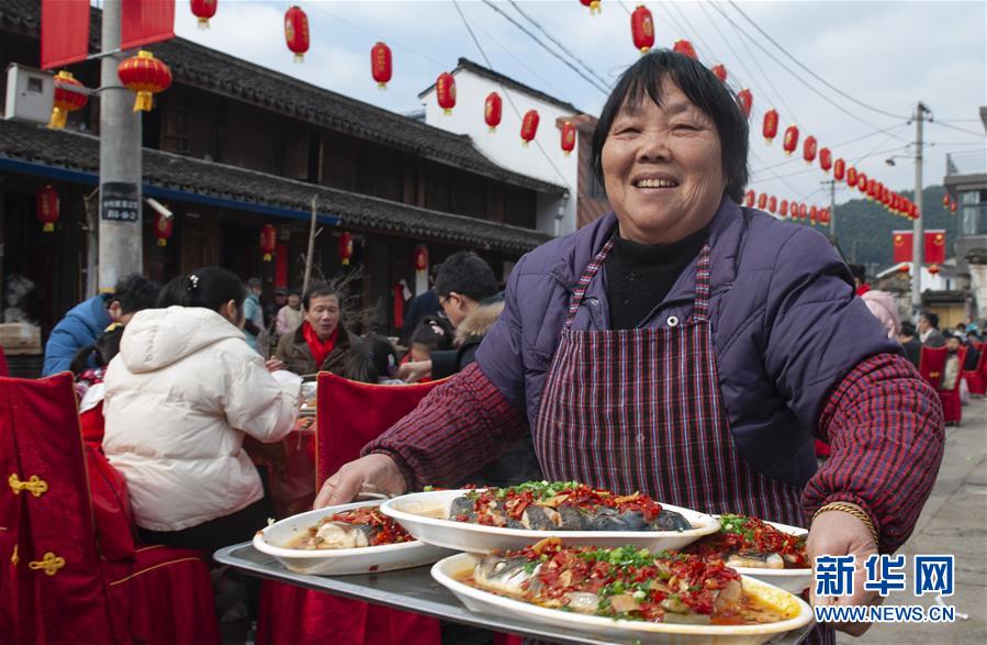 1月26日,鹿亭乡中村村民为齐家长桌宴上菜。 新华社发(张辉 摄)