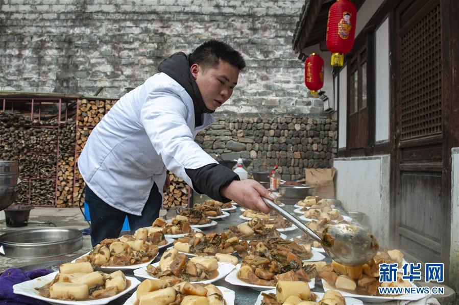 1月26日,鹿亭乡中村村民为齐家长桌宴上菜。 新华社发(张辉 摄)