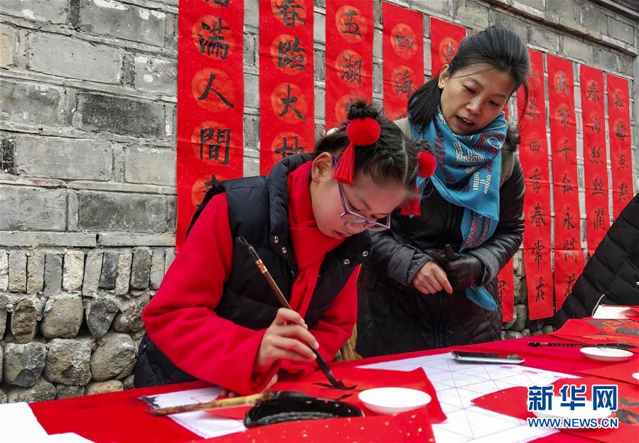 1月26日,一名小朋友在鹿亭乡中村为游客书写福字。 新华社发(张辉 摄)