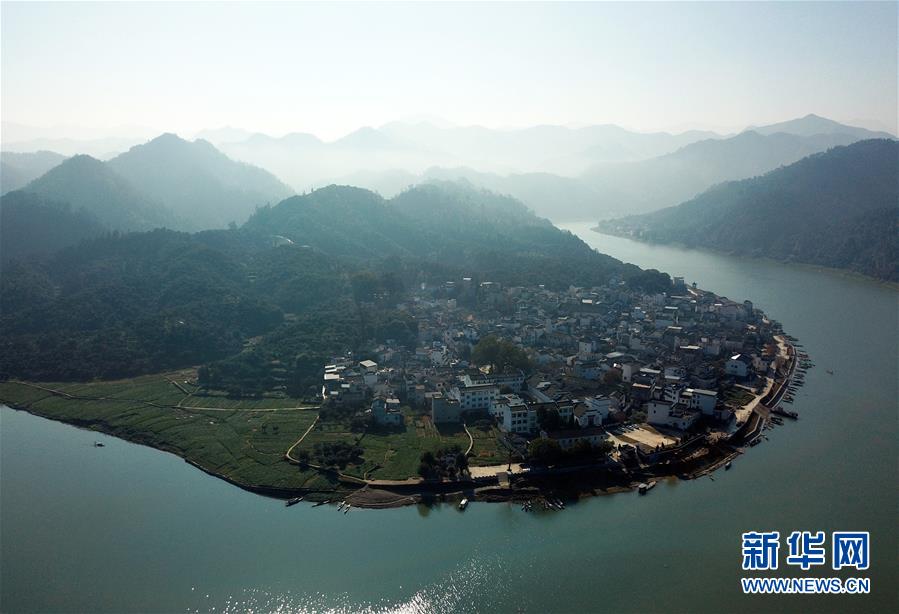 1月18日在安徽省黄山市歙县拍摄的新安江山水画廊美景(无人机拍摄)。 新华社发(施亚磊 摄)