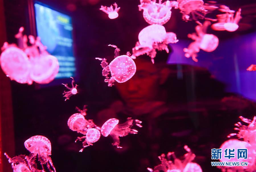 1月26日,人们在贵州极地海洋世界的水母馆内参观。 新华社发(韩贤普 摄)