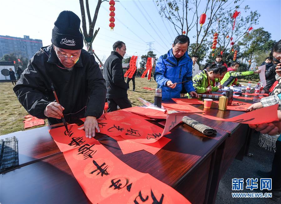 1月27日,书法爱好者在西苑村文化礼堂前写春联。 新华社记者 徐昱 摄