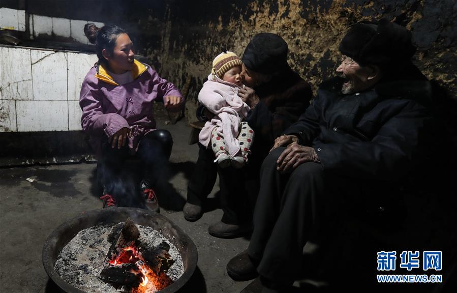 1月25日,杨文英(右二)亲吻9个月大的重外孙林志远。 新华社记者 江宏景 摄