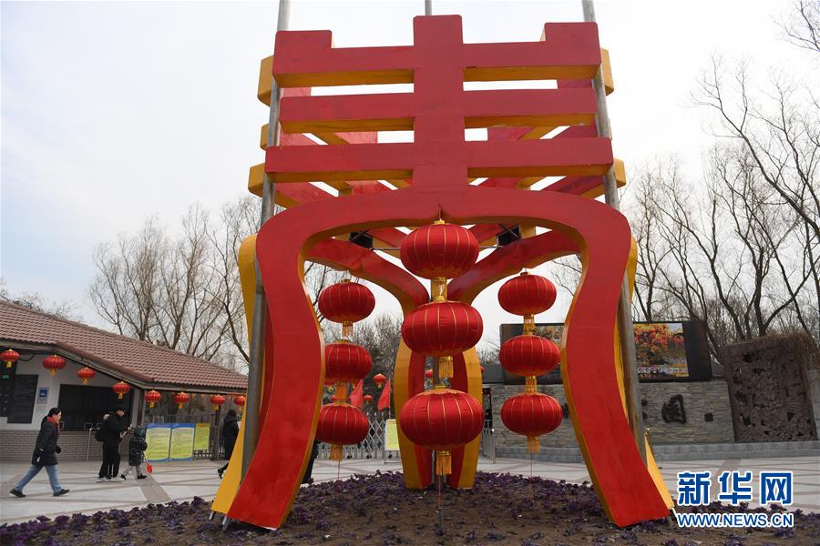 1月27日拍摄的玉渊潭公园西门外“春”字布景装饰。新华社记者 李俊东 摄