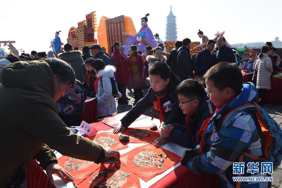 1月27日,小学生在活动现场观看书法家创作。新华社记者 尹炣 摄
