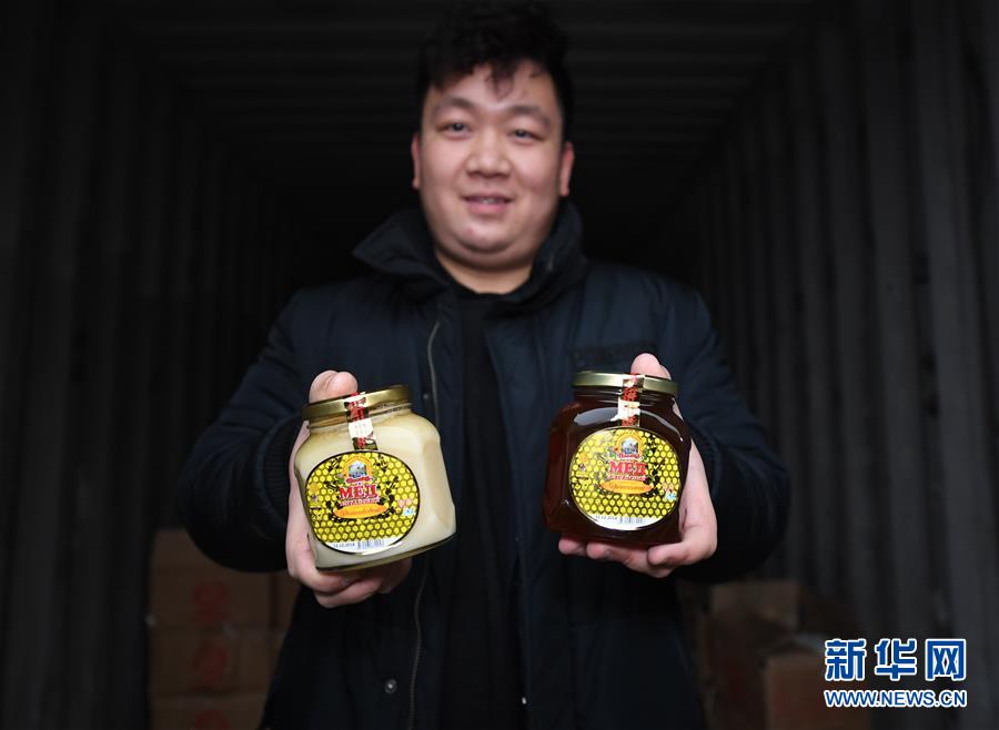 1月27日,西安骆驼客电子商务有限公司员工展示该公司从哈萨克斯坦进口的蜂蜜。新华社记者 李一博 摄