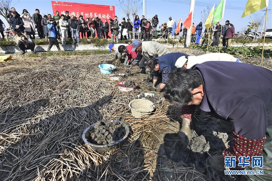 1月27日,三星村村民在参加挖荸荠比赛。 当日,杭州市余杭区塘栖镇荸荠主产区三星村举办了一场别开生面的荸荠运动会,村民参加田间挖荸荠和荸荠削皮比赛,吸引了许多游客前来观赛。 新华社发(李忠 摄)