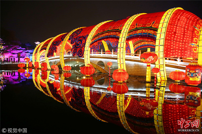 2019年1月27日,西安,桥上一半、水中一半,虚虚实实,芙蓉桥上的彩灯像一个巨大的长灯笼。魏永贤/视觉中国