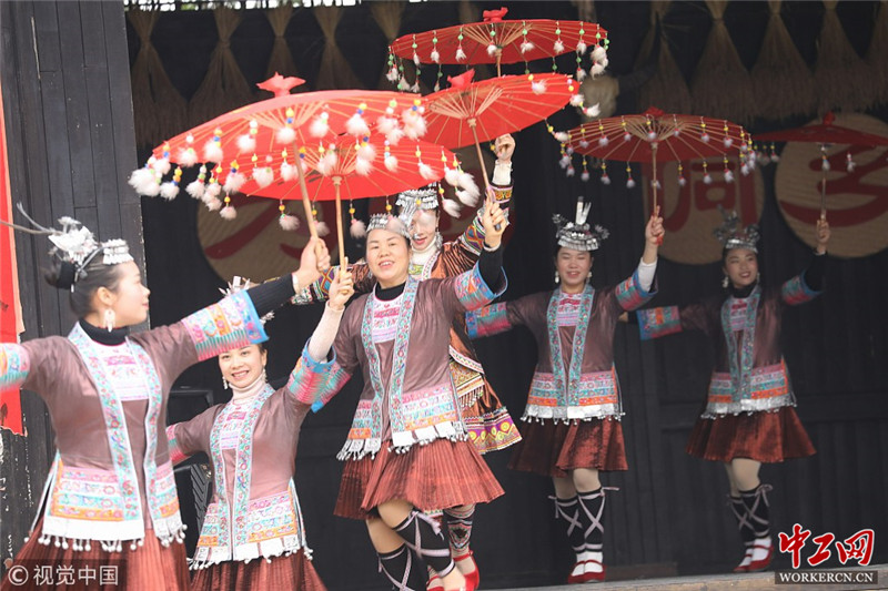 2019年1月27日,广西三江侗族自治县林溪镇平寨的侗族妇女跳起侗族舞蹈迎新春。王滋创/视觉中国
