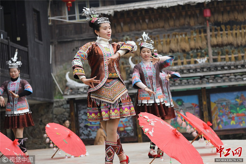 2019年1月27日,广西三江侗族自治县林溪镇平寨的侗族妇女跳起侗族舞蹈迎新春。王滋创/视觉中国