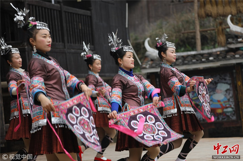 2019年1月27日,广西三江侗族自治县林溪镇平寨的侗族妇女跳起侗族舞蹈迎新春。王滋创/视觉中国
