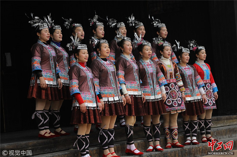 2019年1月27日,广西三江侗族自治县林溪镇平寨的侗族妇女唱起侗族大歌迎新春。王滋创/视觉中国