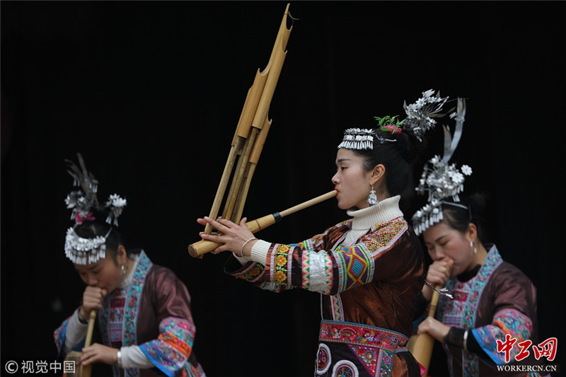 2019年1月27日,广西三江侗族自治县林溪镇平寨的侗族群众吹奏芦笙迎新春。王滋创/视觉中国
